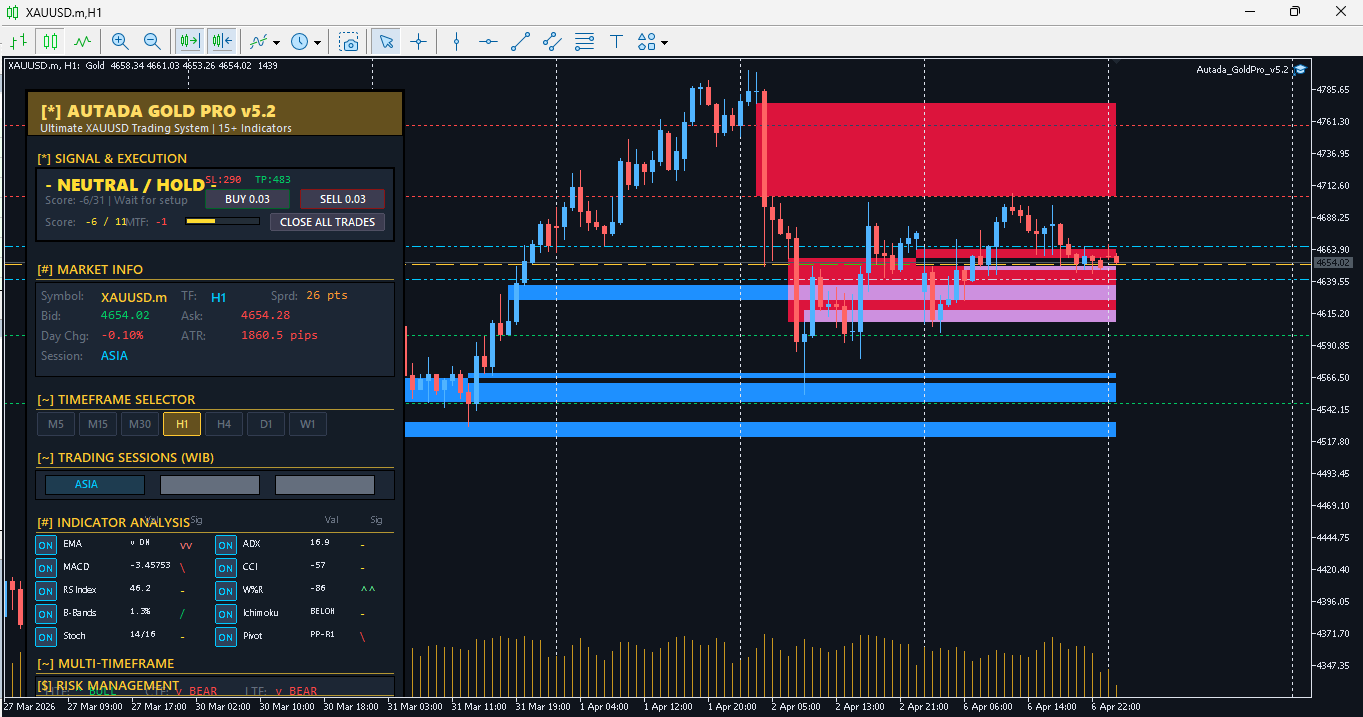 Tapi pengguna Autada Gold Pro v5.2 tahu bahwa indikator hanyalah *alat bantu* (secondary confirmation). Struktur Harga dan FVG adalah hukum utama (primary logic). Sistem memilih untuk berkata "HOLD" hari ini di sesi Asia karena harga tidak sedang menyentuh dinding FVG mana pun. Ini adalah contoh sempurna bagaimana penggunaan teknologi mencegah kita dari *overtrading*.